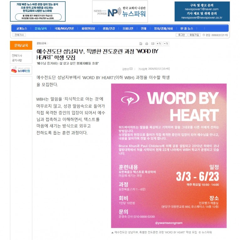 [기사] 예수전도단 성남지부, 특별한 전도훈련 과정 ‘WORD BY HEART’ 학생 모집(뉴스파워)